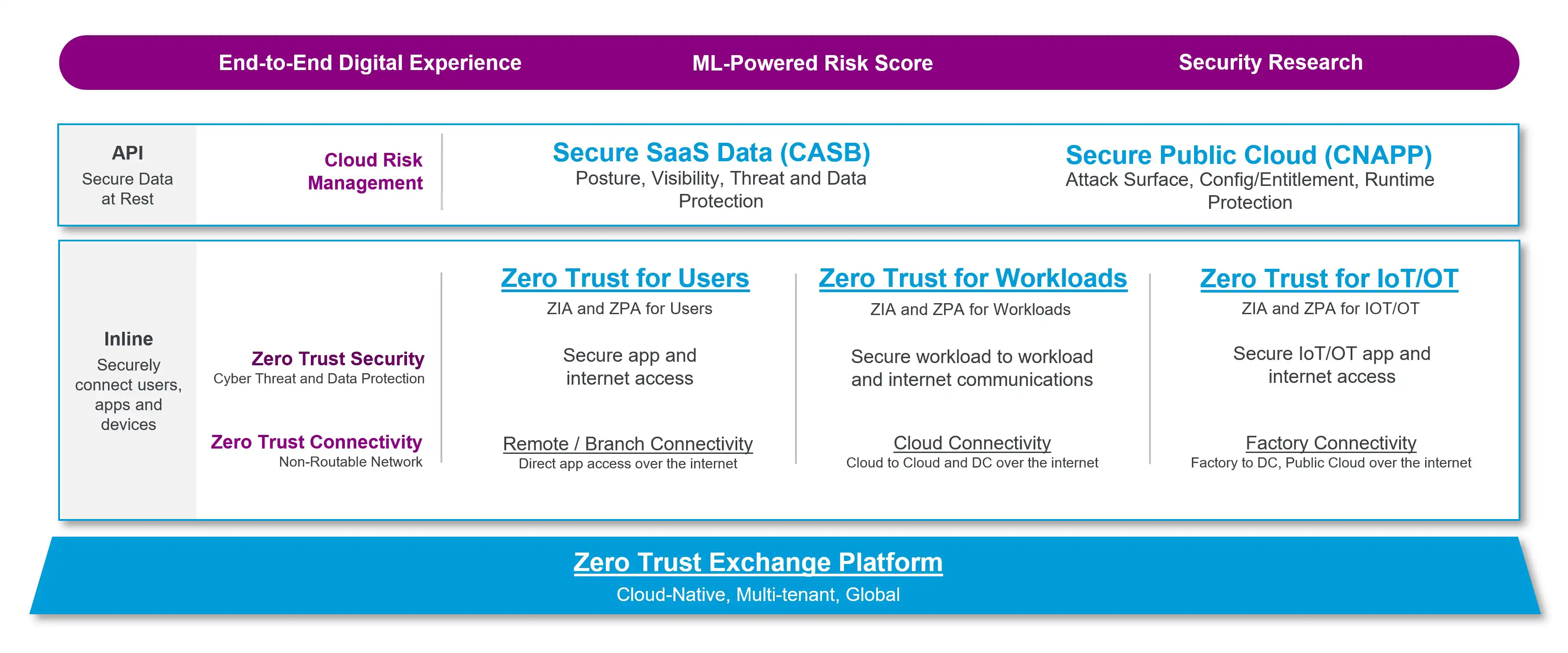 Zscaler’s Zero Trust Exchange is a cloud-native platform that securely connects users, devices, and workloads to applications—never the network. Unlike traditional VPNs or firewalls, it applies identity- and context-based policies to ensure only authorized access, minimizing the attack surface. The platform delivers Zero Trust Network Access (ZTNA), secure web gateway (SWG), CASB, firewall, and data protection in one integrated service. With inline inspection of encrypted traffic and real-time threat prevention, the Zero Trust Exchange reduces risk, prevents lateral movement, and improves user experience. It enables enterprises to adopt cloud and hybrid work securely, at scale, and with confidence.